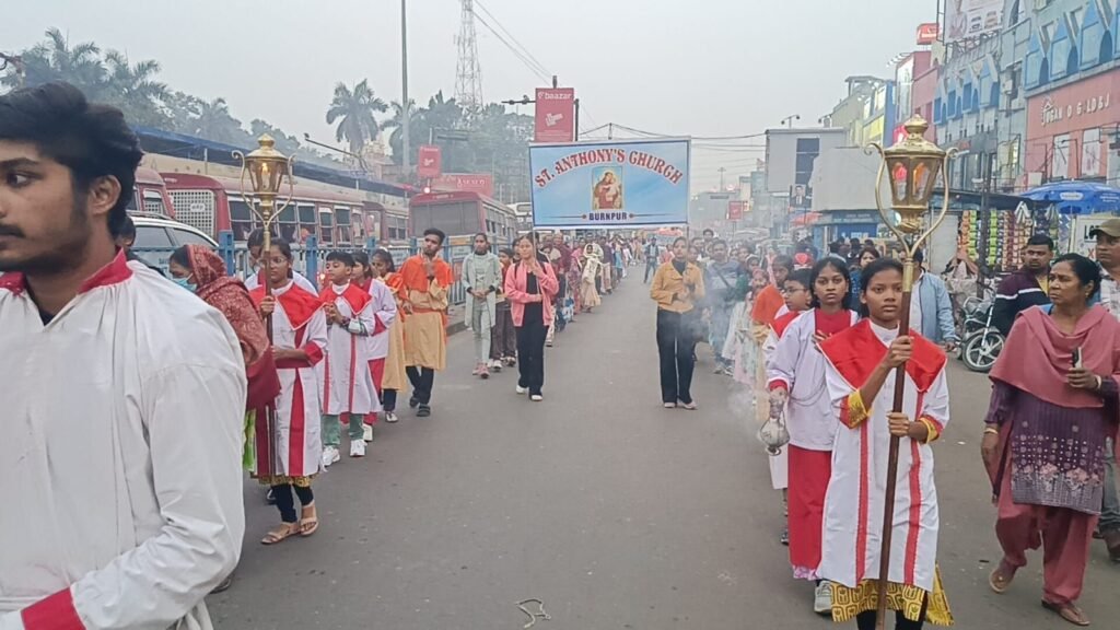 पब्लिक न्यूज़ आसनसोल:– कुछ दिनों बाद पूरे विश्व के साथ-साथ आसनसोल में भी क्रिसमस मनाया जाएगा इससे पहले आज आसनसोल में ईसाई समुदाय के लोगों द्वारा एक जुलूस निकाला गया यह जुलूस सेक्रेड हार्ट चर्च से निकलकर चेलीडंडाल में सेंट जॉन्स चर्च तक गया इसके बारे में जानकारी देते हुए सेंट जॉन’एस चर्च के पादरी फादर डॉल्फिन मथायस ने बताया कि ईसा मसीह की कृपा सब पर बनी रहे और सारे विश्व के लोग सुख और शांति के साथ अपना जीवन बिता सके इसके लिए आज इस जुलूस का आयोजन किया गया आज चर्च में उपासना हुई प्रार्थना की गई और अब जुलूस निकाला गया है जिसमें बड़ी संख्या में ईसाई समुदाय के लोग शामिल हैं