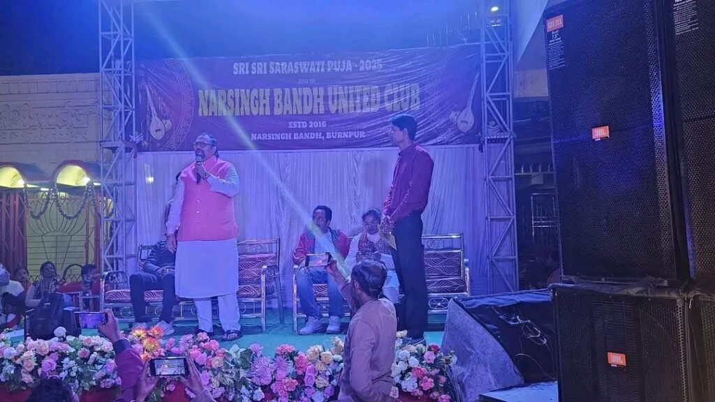 पब्लिक न्यूज़ आसनसोल रिकी बाल्मीकि:– विद्या की देवी मां सरस्वती की आराधना को लेकर पूरे शिल्पांचल में तैयारियां पूरी कर ली गई है। वहीं दूसरी तरफ बर्नपुर के नरसिंहबांध इलाके में नरसिंहबांध यूनाइटेड क्लब द्वारा भव्य पूजा पंडाल का निर्माण कर मां सरस्वती की काफी मनमोहक प्रतिमा स्थापित की गई है। शुक्रवार की शाम काफी धूमधाम के साथ पूजा पंडाल का उद्घाटन किया गया। इस अवसर पर आयोजित उद्घाटन समारोह में मुख्य अतिथि के रूप में तृणमूल राज्य सचिव वी शिव दासन दास के साथ अतिथियों ने बोरो चेयरमैन शिवानंद बाउरी, पार्षद गुरमीत सिंह, बबीता दास, सुनीता मलिक आदि उपस्थित थे। इस दौरान बच्चों द्वारा रंगारंग सांस्कृतिक कार्यक्रम प्रस्तुत कर सभी को मंत्रमुग्ध कर दिया। वहीं बोरो चेयरमैन शिवानंद बाउरी के साथ मौजूद अतिथियों ने पूजा पंडाल का फीता काटकर एवं दीप जलाकर सरस्वती पूजा का उद्घाटन किया। नरसिंहबांध यूनाइटेड क्लब द्वारा 10वे वर्ष सरस्वती पूजा का आयोजन किया गया है।