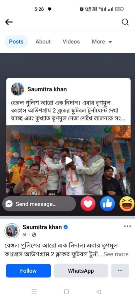 পাবলিক নিউজঃ বুদবুদ:-বুদবুদের কোটা গ্রাম পঞ্চায়েতের বলরামপুরে দুদিন ব্যাপী ফুটবল প্রতিযোগিতার আয়োজন করা হয়েছিল। রবিবার চূড়ান্ত পর্যায়ের খেলা অনুষ্ঠিত হয়। সেই খেলায় মঞ্চে উপস্থিত ছিলেন আউসগ্রাম ২ নম্বর ব্লকের তৃণমূলের ব্লক সভাপতি শেখ আবদুল লালন, এছাড়াও ছিলেন তৃণমূল নেতা তথা কোটা গ্রাম পঞ্চায়েতের উপপ্রধান আলাউদ্দিন মন্ডল সহ কোটা অঞ্চল তৃণমূল কংগ্রেসের কর্মী সমর্থকরা। এই অনুষ্ঠান মঞ্চে ব্লক সভাপতিকে বরণ করে নেওয়ার সময় বুদবুদ থানার এক পুলিশ অফিসার হেমন্ত দত্তকে হাততালি দিতে দেখা যায়। সোমবার সমাজ মাধ্যমে সেই ভিডিও পোস্ট করে ঘটনার তীব্র নিন্দা জানান বিজেপির সাংসদ সৌমিত্র খাঁ। সমাজ মাধ্যমে তিনি লেখেন বেঙ্গল পুলিশের আরও এক নিদান। এবার তৃণমূল কংগ্রেস আউসগ্রাম ২ নম্বর ব্লকের ফুটবল টুর্নামেন্টে দেখা যাচ্ছে এবং তৃণমূল নেতা শেখ লালনকে সম্বর্ধনা জানানোর সময় হাততালি দিচ্ছেন পুলিশ আধিকারিক। পশ্চিমবঙ্গের পুলিশের প্রতি বাংলার মানুষের কোন আস্থা নেই, যারা তৃণমূল কংগ্রেসের নিছক রাজনৈতিক পাদদেশে পরিণত হয়েছে বলে দাবি করেছেন তিনি।সমাজ মাধ্যমে এই ঘটনা প্রকাশ্যে আসতেই তীব্র নিন্দার ঝড় উঠেছে রাজনৈতিক মহলে।