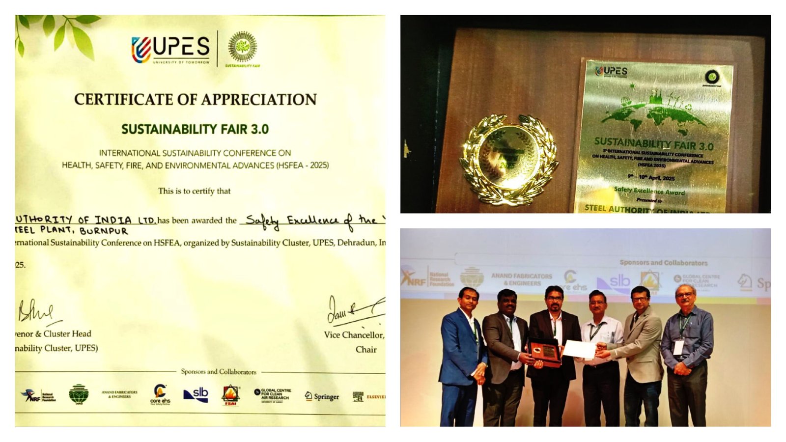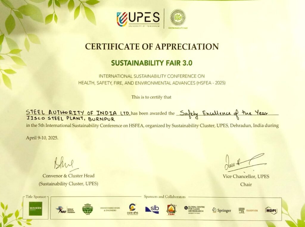 পাবলিক নিউজ আসানসোল :– বার্নপুর সেল আইএসপি বা ইস্কো কারখানাকে “সেফটি এক্সেলেন্স অ্যাওয়ার্ড”-এ ভূষিত করা হয়েছে ইন্টারন্যাশনাল সাসটেইনেবিলিটি কনফারেন্স অন হেলথ সেফটি, ফায়ার অ্যান্ড এনভায়রনমেন্টাল অ্যাডভান্সেস ( এইচএসএফইএ ২০২৫ )-এ। এই সম্মেলন ৯ ও ১০ এপ্রিল দেরাদুনে অনুষ্ঠিত হয়। যার আয়োজক ছিল ইউপিইএস, দেরাদুনের স্কুল অব অ্যাডভান্সড ইঞ্জিনিয়ারিং-এর সাসটেইনেবিলিটি ক্লাস্টার।