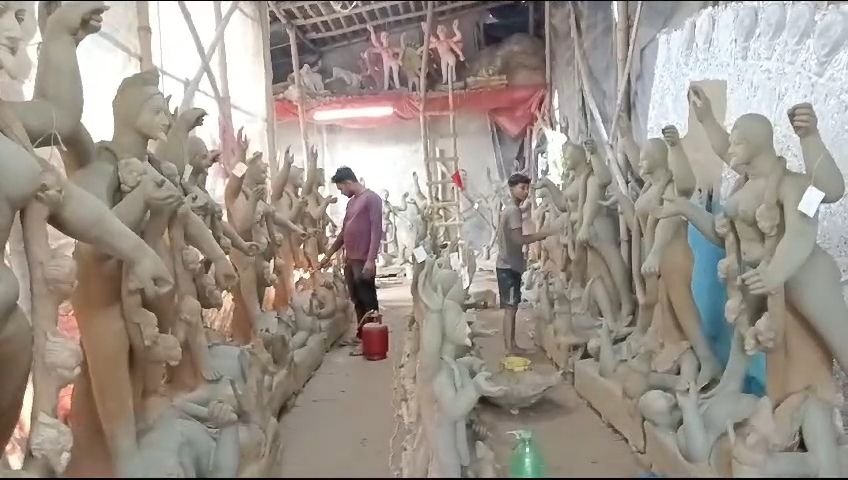 পাবলিক নিউজঃ অলোক চক্রবর্তী আসানসোল:– হাতে মাত্র তিনটি দিন তারপর কালিপূজা অথচ কালি প্রতিমা তৈরী হয় নি, অবিরাম বৃষ্টির কারণে কালি প্রতিমার মাটি শুকোয় নি প্রতিমা এখনো কাঁচা অবস্থায় রয়েছে মৃৎশিল্পীরা আপ্রাণ চেষ্টা করে যাচ্ছে দুদিনের মধ্যে প্রতিমা শুকিয়ে রং করে পূজার প্যান্ডেলে পৌঁছাতে। মৃৎশিল্পী দীপ পাল জানান বর্ষার জন্য প্রতিমা সব কাঁচা রয়ে গেছে গ্যাস এনে ব্লো ল্যাম্প চালিয়ে প্রতিমা শুকাতে হচ্ছে বর্ষার কারণে অতিরিক্ত কর্মী রাখা হয়েছে তারা ব্লো ল্যাম্প দিয়ে প্রতিমা শুকোনোর কাজ করছে। দীপ পাল জানান প্রতিমার জন্য মূল্যর বেশীরভাগ এই বছর গ্যাসের পেছনে খরচ হয়ে যাচ্ছে, অন্যান্য বছরের তুলনায় এই বছর প্রতিমার দাম বাড়ানো হয় নি কিন্তু গ্যাস কিনতে গিয়ে সব পয়সা গ্যাসের পেছনে চলে যাচ্ছে উপরন্তু বর্ষার৷ কারণে অতিরিক্ত কর্মী রাখা হয়েছে তার খরচ বেড়ে গেছে।