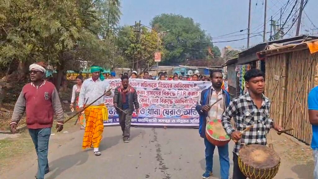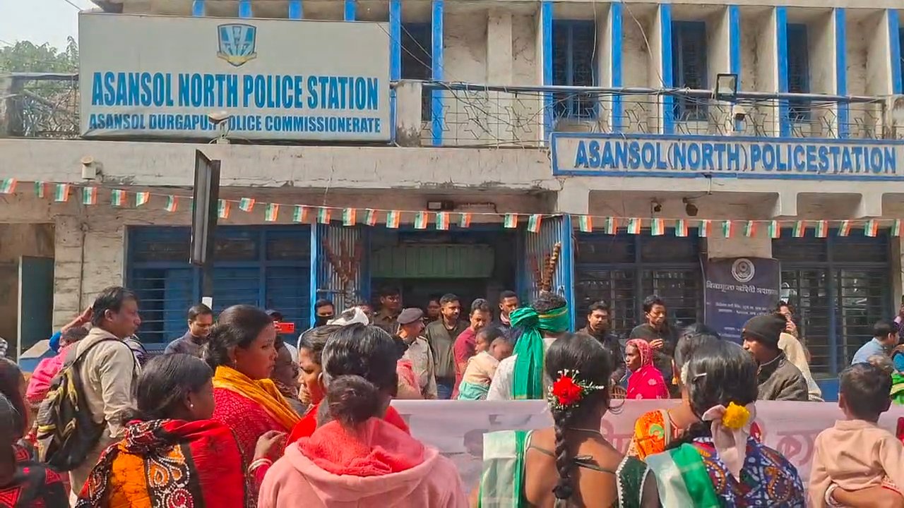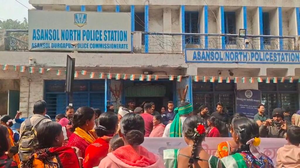 आदिवासी महिला से उत्पीड़न और जमीन कब्जाने का आरोप बीजेपी नेता परगिरफ्तारी की मांग को लेकर आसनसोल उत्तर थाना में आदिवासी समुदाय का प्रदर्शन