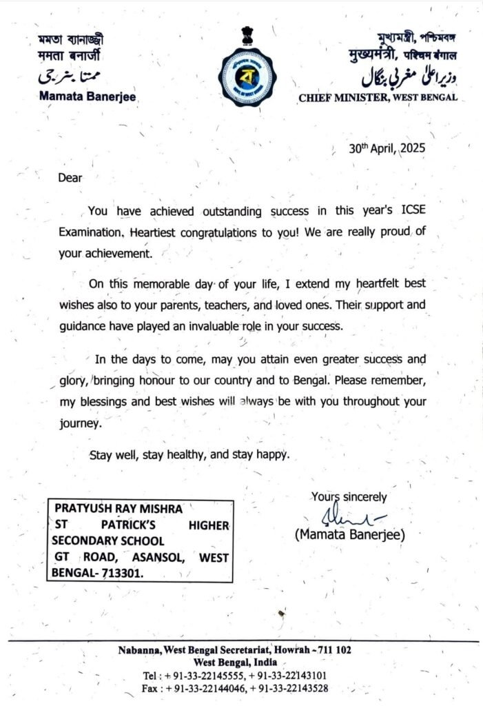 পাবলিক নিউজ আসানসোল :– আসানসোলের প্রত্যুষ রায় মিশ্র ২০২৫ আইসিএসইতে ৯৯.২ শতাংশ নম্বর পেয়েছে। তার এই সাফল্যের জন্য রাজ্যের মুখ্যমন্ত্রী মমতা বন্দ্যোপাধ্যায় তাকে অভিনন্দন জানিয়েছেন। আসানসোলের সেন্ট প্যাট্রিক্স স্কুলের ছাত্র প্রত্যুষ রাশ মিশ্র ২০২৫ সালের আইসিএসই বোর্ড পরীক্ষায় ৯৯.২% নম্বর পেয়ে দুর্দান্ত ফল করেছে।